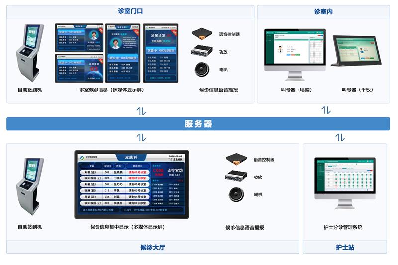 包括排隊服務(wù)管理系統(tǒng)、護士導(dǎo)診系統(tǒng)、叫號器叫號系統(tǒng)(兼容硬件叫號器和軟件叫號器)、一級分診多媒體系統(tǒng)(候診區(qū)綜合顯示屏上運行的系統(tǒng),常規(guī)42-65寸)、二級分診多媒體系統(tǒng)(在醫(yī)生門診門口顯示屏上運行的系統(tǒng),支持18.5-22寸屏顯示)、自助簽到系統(tǒng)(自助機上運行的簽到系統(tǒng)),其中支持將音箱喇叭集成到液晶一體機中,也支持外接功放和音箱。